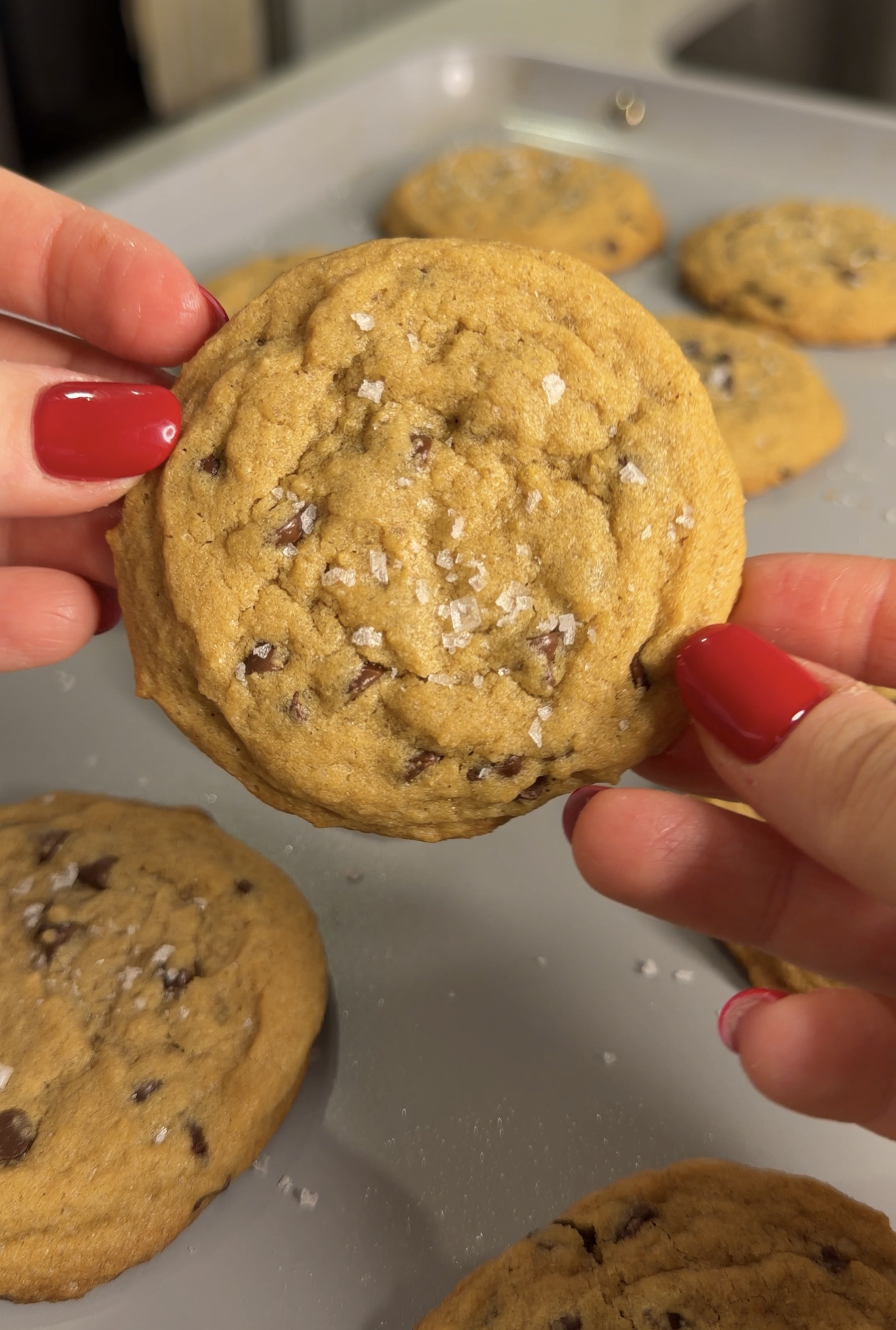 0 Preheat oven to 350°F and line a baking sheet with parchment paper. 1 In a large bowl, whisk together the softened butter, brown sugar, and granulated sugar until smooth and fully combined. If the butter is not softened, microwave the stick in its wrapper for about 5 seconds per side until soft but not melted. 2 Whisk in the egg and vanilla extract until the mixture is glossy and cohesive. 3 Add the flour, baking soda, and kosher salt. Stir gently just until no dry streaks remain. Avoid overmixing to keep the cookies tender. 4 Fold in the chocolate chips until evenly distributed throughout the dough. 5 Using a 2-tablespoon scoop or measuring spoon, portion 12 dough balls onto the prepared baking sheet, spacing them about 2 inches apart. Do not flatten the tops. 6 Bake for 10 to 12 minutes, until the edges are lightly golden and the centers still appear slightly soft. The cookies may look slightly puffy when removed from the oven. 7 Immediately sprinkle with flaky sea salt. Let the cookies cool on the baking sheet for 5 minutes, they will continue to set and gently deflate. Transfer to a wire rack to cool completely.View original recipe