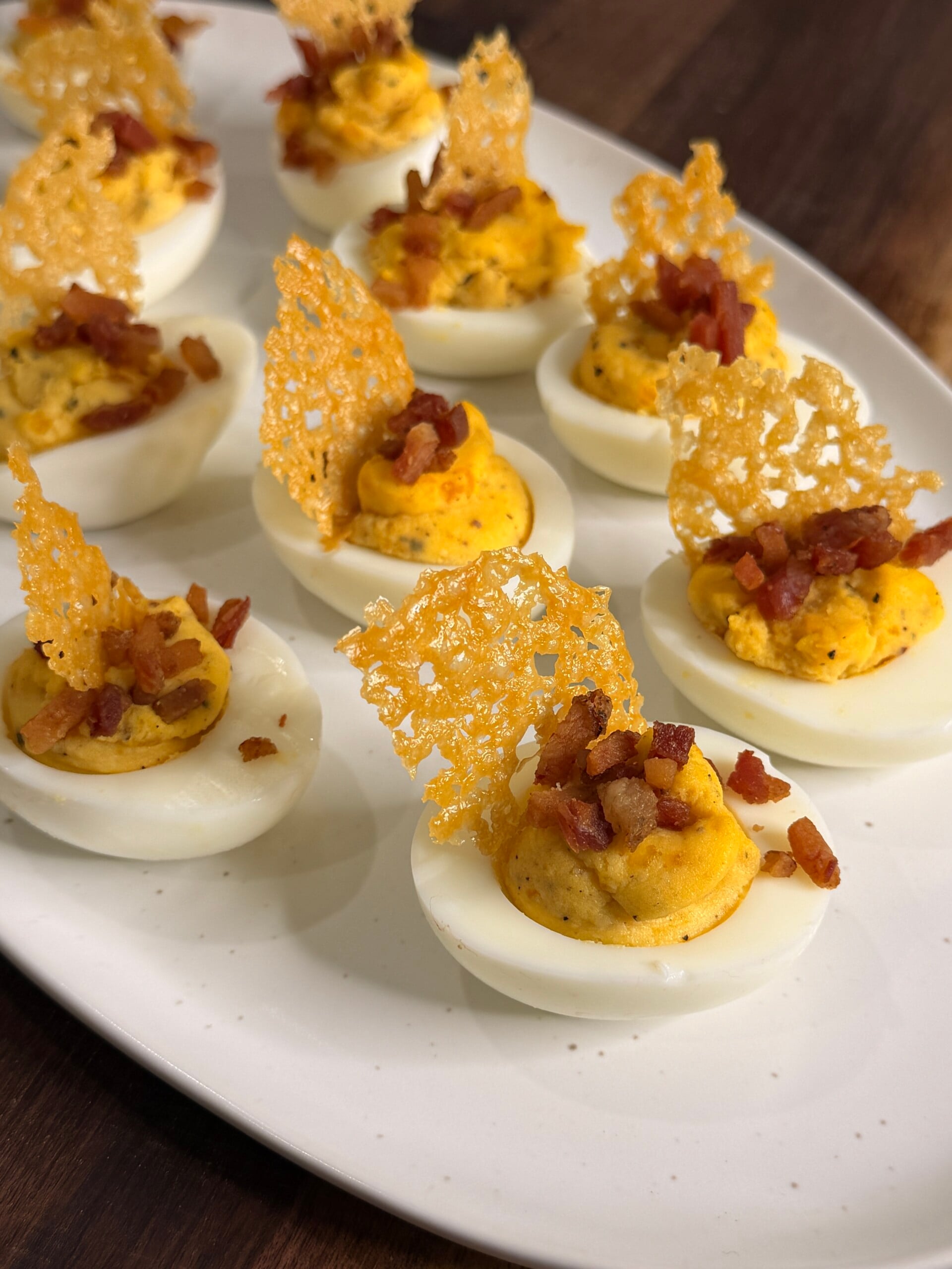A playful, carbonara-inspired take on deviled eggs with a creamy Parmigiano filling, crispy guanciale, and golden parm crisps.