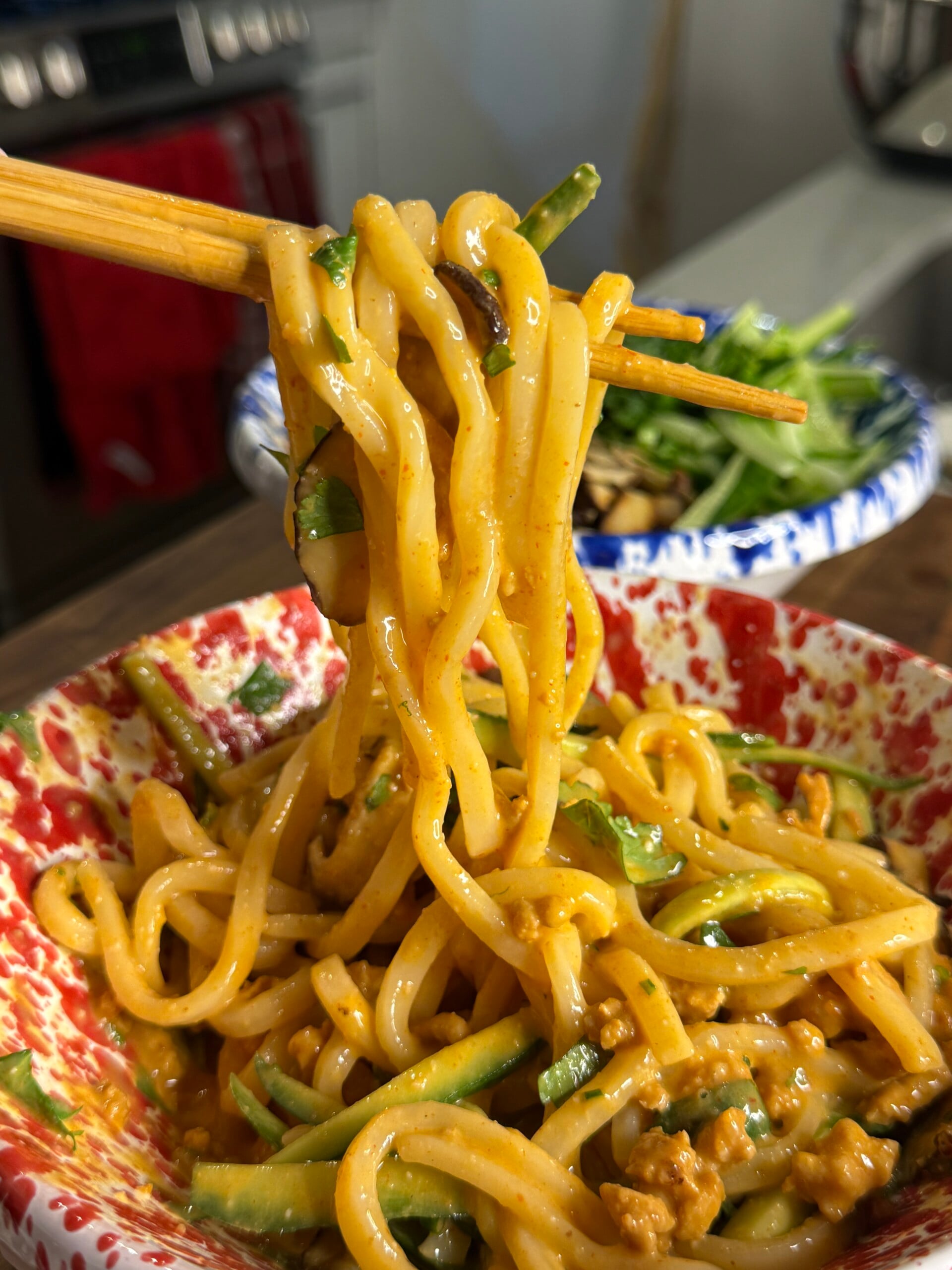 Peanut Butter Udon with Spicy Chicken and Veggies